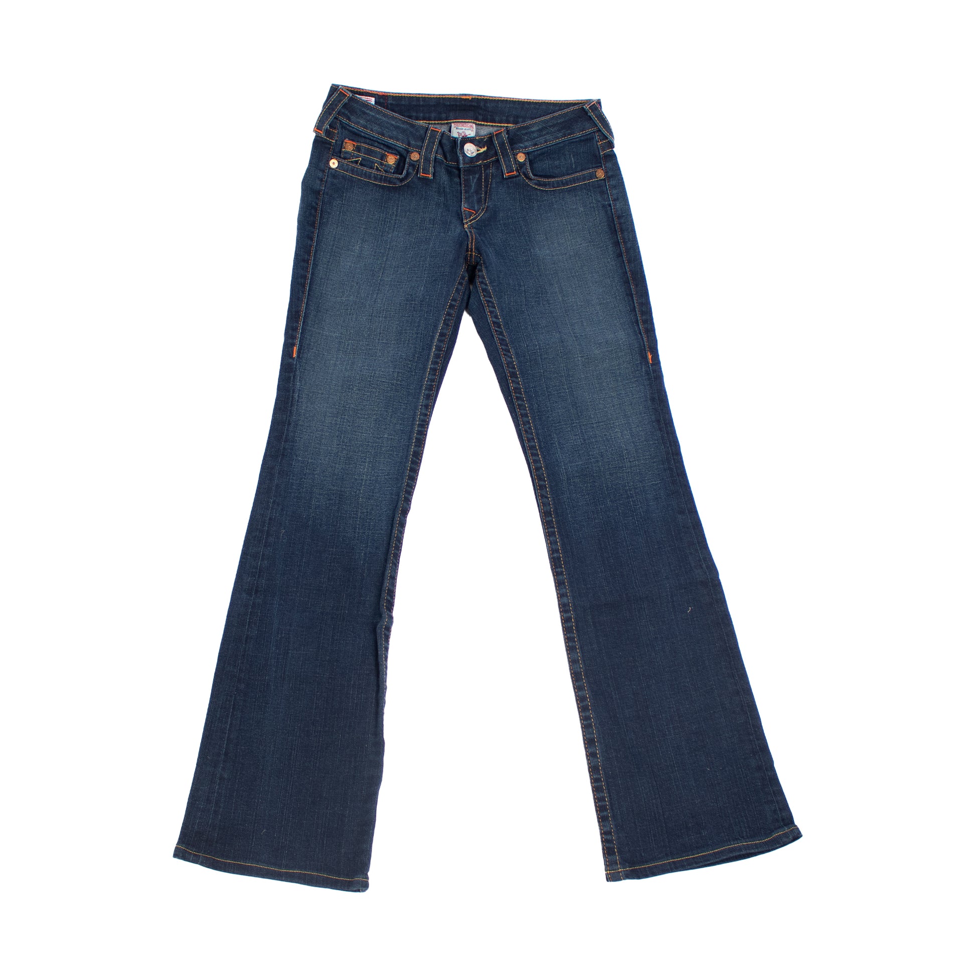 These True Religion bootcut jeans impress with their timeless Y2K style and the striking Big T seams. The characteristic horseshoe embroidery on the back pockets and the True Religion logo on the patch give the jeans an unmistakable look. The bootcut cut ensures a flattering fit and combines comfort with high-quality denim. A real statement piece for fans of premium denim and 2000s streetwear.